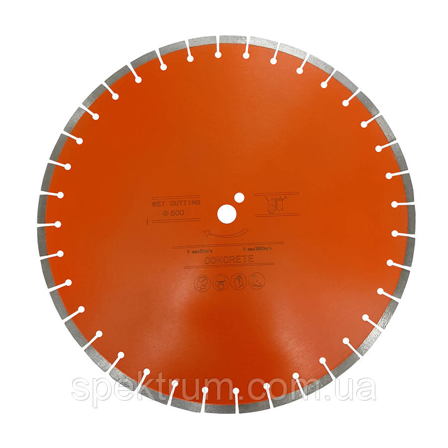 Відрізний круг сегментний Spektrum універсальний 500 призначений для різання прямого по сучасному та свіжому бетонному покриттю, неармованому та армованому, а також по асфальту, каменю.